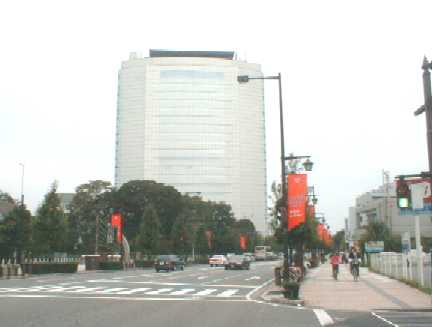 真っ直ぐ行くと右側に台形の建物が見えてくる。