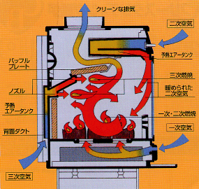 自動的に燃焼室に供給され、微粒子、CO、タールなどを三次燃焼させます。この燃焼方式によって、